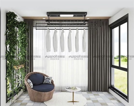 阳台晾晒,装可隐藏晾衣架,欧斯宝智悦·声控晾衣架采用的是航空铝型材,经久耐用,超薄机身,整体收拢仅10CM,可完全折叠收拢,不占空间,层高不压抑,拥有35KG承重,可轻松晾晒全家一周换洗衣物,一键升降、遇阻即停、轻松省力。带LED灯+晾衣架+消毒烘干,功能和颜值都在线。