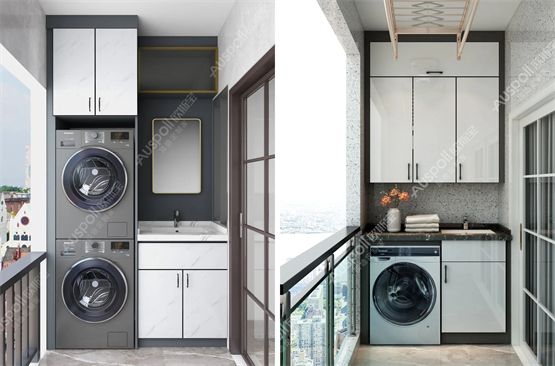 在阳台一侧做成阳台柜,嵌入式洗衣机、烘干机,秒变洗衣房。上方吊柜增加阳台的储物空间,侧方再打造一个宽敞美观的大洗手台,一定程度上节约时间。使得整体布局简洁又大方。欧斯宝定制阳台柜采用优质铝合金基材,防水、防晒、防火等,表面使用高温热转印工艺,使其不会在阳光的照射下褪色,变形。