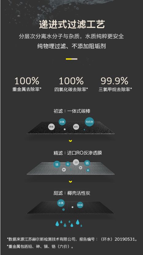 在初滤阶段,卡赫通过一体式碳棒将水中的余氯、异味、异色以及有机物进行初次过筛除。而后,进口杜邦陶氏RO反渗透膜将带领饮用水正式进入精滤阶段,多页膜技术卷制的进口杜邦陶氏RO反渗透膜可让其精密过滤可至0.0001微米,不仅能对重金属、有害物质进行精细化过滤,还能保障出水效率更高。官方数据显示,在精滤阶段,卡赫所使用的进口杜邦陶氏RO反渗透膜及净水技术能达到滤芯从拆封使用到使用寿命结束周期内100%去除水中的铬、镉、铅。
