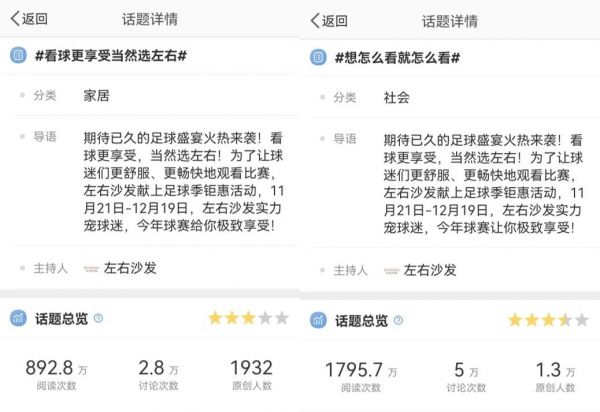 随着黄健翔、刘语熙喊你回家看球视频发布,热浪也随之而来,在各圈层KOL的持续参与和互动中,#看球更享受当然选左右#、#想怎么看就怎么看#阅读分别高达892.8w、1795.7W,迅速成为热门话题。