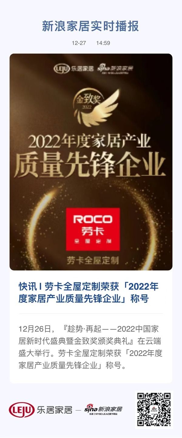12月26日,『趁势·再起——2022中国家居新时代盛典暨金致奖颁奖典礼』在云端盛大举行。劳卡全屋定制荣获「2022年度家居产业质量先锋企业」称号。