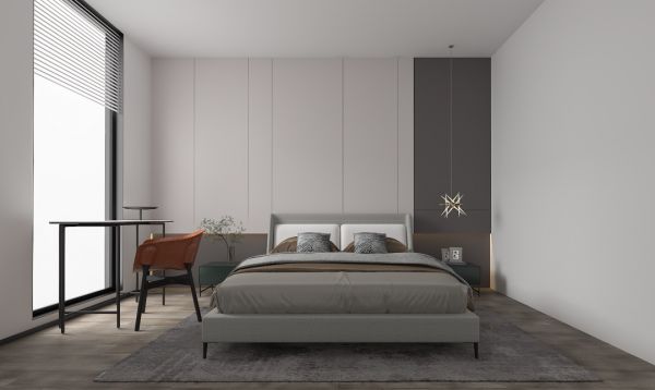 原木色与米灰色自然过渡,赋予空间流动感与质朴感。墙柱隔断,空间布局满足基础功能而不显拥挤。CBD家居·金豹 | J051软床,米色温柔高级,甄选皮质提高整体格调,简约而不质感.