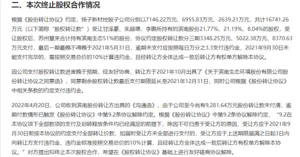 据扬子新材披露,因公司支付股权转让款进度晚于预期,经友好协商,转让方于2021年10月出具《关于滨南生态环境股份有限公司股份转让协议之同意函》,同意剩余股权转让款最后支付期限延长至2021年12月31日,同时公司根据《股份转让协议》中相关条款的约定支付违约金。