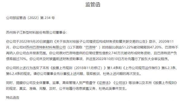 据深交所10月12日下发的监管函显示,扬子新材2022年9月20日披露的《关于放弃对控股子公司增资后构成财务资助暨关联交易的公告》显示,2020年11月,公司对苏州巴洛特新材料有限公司(以下简称:巴洛特)持股比例由51.22%被动稀释到47.20%,巴洛特不再纳入公司合并报表范围。公司原对巴洛特提供的日常经营性借款2740万元被动形成财务资助,且巴洛特资产负债率超过70%。