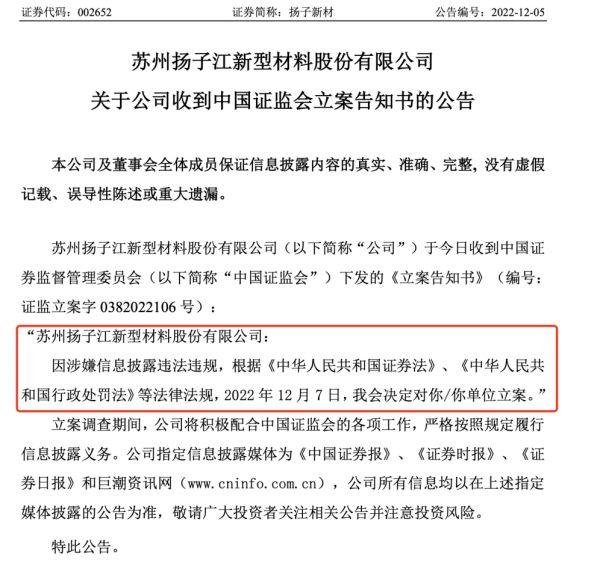 2万股东无眠!市值14亿的建材企业近来摊上大事。12月29日晚,苏州扬子江新型材料股份有限公司(证券简称:扬子新材 证券代码:002652)公告称,因涉嫌信息披露违法违规,证监会决定对公司立案。立案调查期间,扬子新材表示将配合证监会各项工作,严格按照规定履行信息披露义务。
