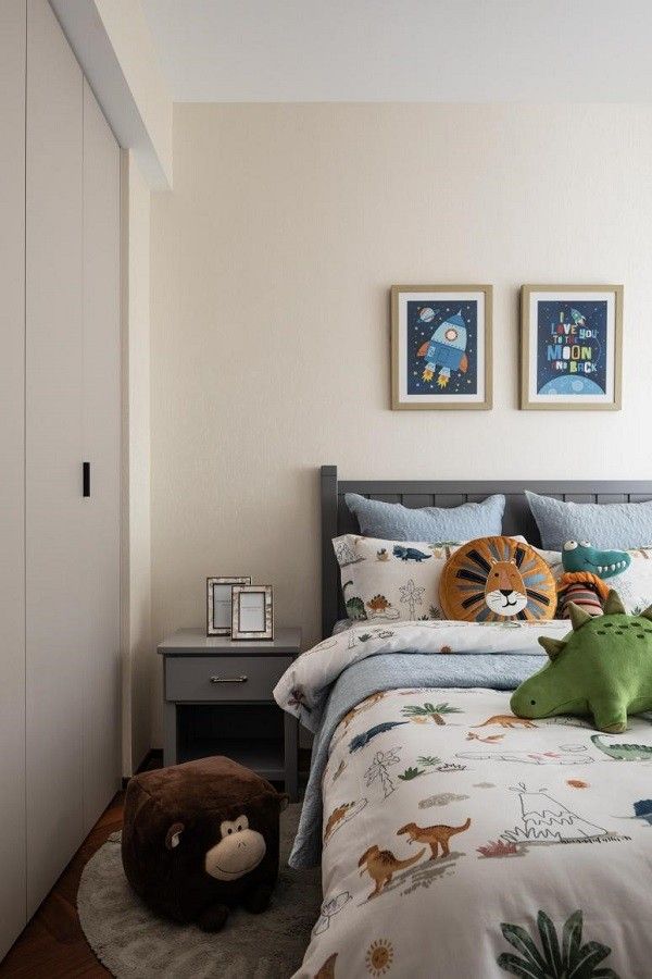 深入案例的不同空间,对空间设计的固化思路也被渐渐打破,在儿童房中带入太空灰的梦幻色彩,用丰富的童趣摆件丰富灵感,呈现出一个布满色彩却又干净流畅的空间。