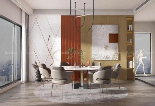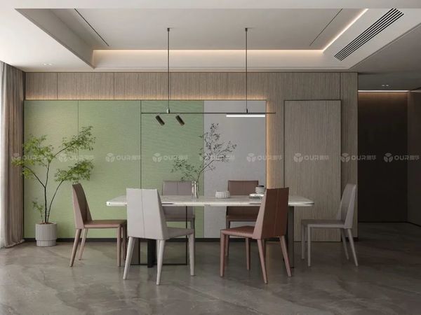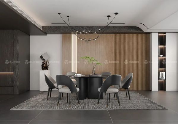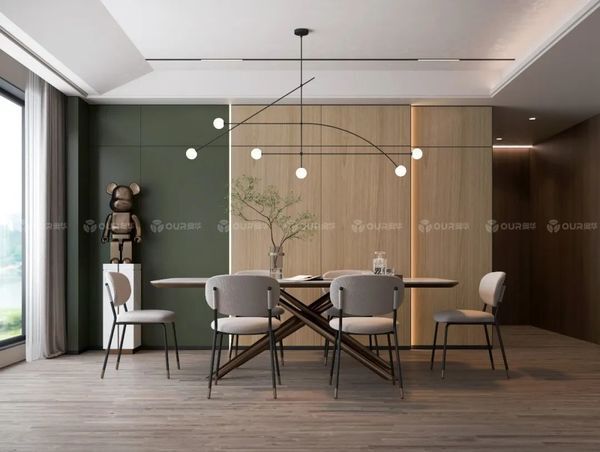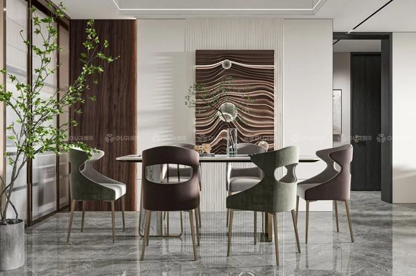 轻奢风的餐厅要在质感上下功夫,就能达到低调有品位的效果。可以通过软装材质的变化丰富层次,比如金属、皮革、玻璃、木材、大理石等材料形成对比,强化风格。