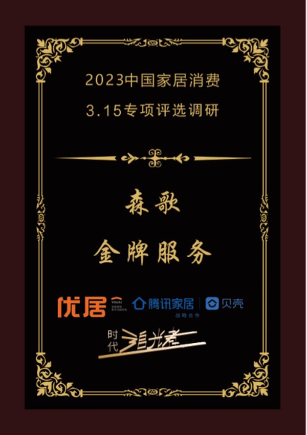 还是以今年森歌的315服务月活动来说。因其行业领先的服务水平,森歌荣获了由腾讯家居、优居颁发的“2023中国家居消费3.15专项评选调研 金牌服务奖”。据悉,森歌是行业独家获此奖项的品牌。而这,不仅再次凸显了森歌硬核服务的专业,也代表着森歌在行业内的引领风范。