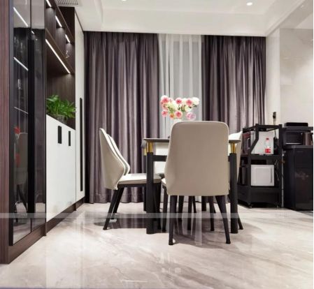 整个客厅是时下流行的大宽厅+落地窗设计,明亮通透、采光充足、视野开阔、一目了然。地面选用简一希腊灰大理石瓷砖铺贴,从过道到客厅一路通铺,0.5mm密缝连纹铺贴技术保障了纹理的连续性,视觉上更加连贯大气。墙面的艺术画和木元素的加入柔和了空间的冰冷感,带来赏心悦目的美感,一进家门就让人倍感舒适。电视背景墙选用简一卡拉拉白,大面积的白色弱化了深色家具带来的厚重感,呈现更清爽舒适的空间效果。