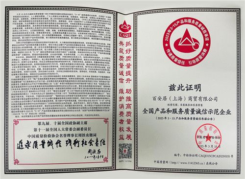 中国质量检验协会自2000年起,就持续携手各行业质量领先品牌,在“3·15”国际消费者权益日期间组织开展“产品和服务质量诚信承诺”主题活动,推动企业质量诚信自律,切实维护消费者权益。多年来,百安居秉承品质至上、服务至上、诚信经营的价值理念,积极助推质量强国战略,以质量放心赢得消费者放心。此次凭借良好口碑及品质形象,在2000多家优秀参与企业中脱颖而出,获得了权威机构的高度认可。