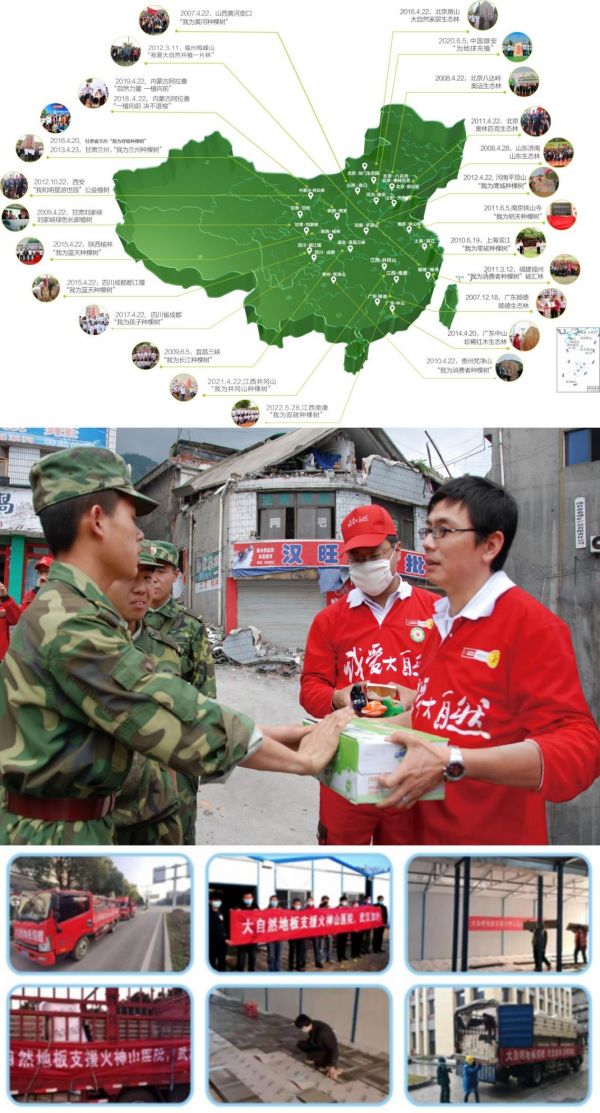 大自然家居深耕公益事业十几年,从2006年启动“中国绿色版图”工程,累计向中国绿化基金会捐资超过1500万元,并每年开展植树活动,截止到2022年,在国内外共种植了27片公益生态林,植树逾80万棵,植树面积超过102万平方米。2008年,汶川地震,大自然家居率先弛援捐资救灾。2020年,新冠疫情爆发,大自然家居先后向武汉火神山医院、湖北五峰县中医院妇幼保健院捐资木地板超2500m²,共克时艰。