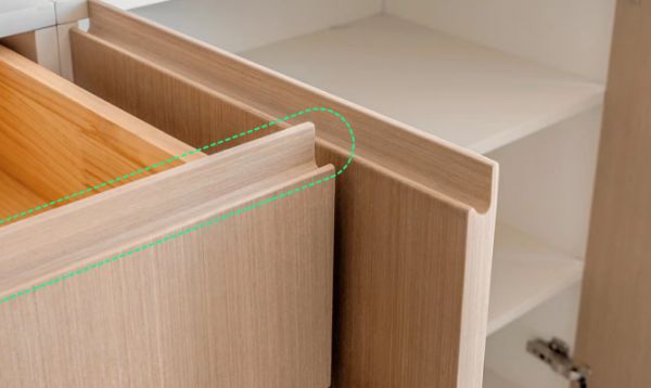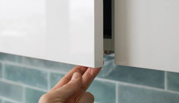 门板向上或向下延长1~2cm,略长于柜体,多出来的部分就可以充当拉手进行开合,这种设计对工艺要求比较低,易于操作,常用于吊柜或者悬空柜。