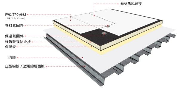 TPO柔性屋面是以彩钢瓦结构屋顶或混凝土结构屋顶为基础,覆盖隔汽层、保温层、防火层及使用寿命超过25年的TPO防水卷材,以解决屋顶的防水和老化问题。因其出众的防水、保温、防火性能,TPO柔性屋顶受到众多业主认可,广泛应用于汽车、航空航天、电子通信、大型体育场馆、商业工业厂房等屋面防水工程。