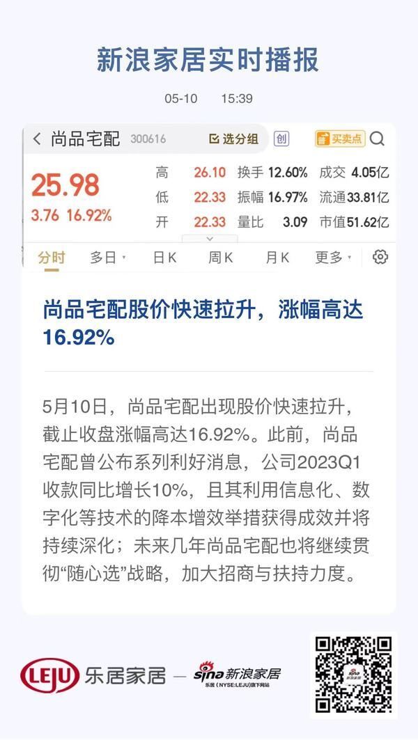 5月10日,尚品宅配出现股价快速拉升,截止收盘涨幅高达16.92%。此前,尚品宅配曾公布系列利好消息,公司2023Q1收款同比增长10%,且其利用信息化、数字化等技术的降本增效举措获得成效并将持续深化;未来几年尚品宅配也将继续贯彻“随心选”战略,加大招商与扶持力度。