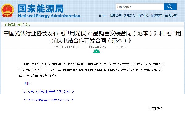 2022年国家能源局网站发布消息称,日前,中国光伏行业协会在充分征求各方面意见基础上,编制发布了《户用光伏产品销售安装合同(范本)》和《户用光伏电站合作开发合同(范本)》。供居民用户和光伏开发企业、户用光伏经销商等各方参考。