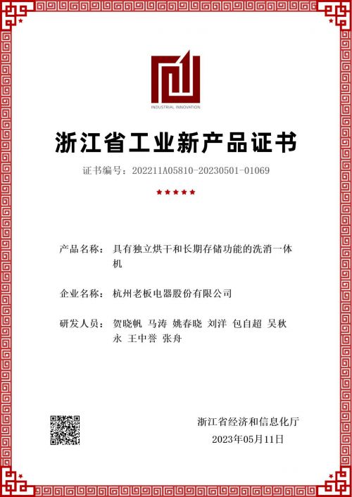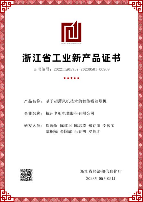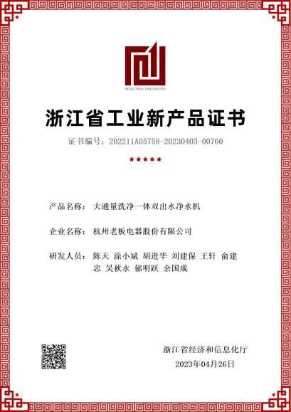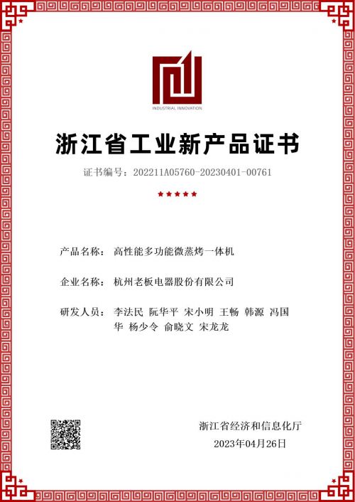 近日,杭州老板电器股份有限公司(以下简称“老板电器”)承担的五项省级工业新产品通过了浙江省经济和信息化厅鉴定验收,并正式公布了工业新产品鉴定证书。专家组对老板电器新产品的研发技术水平给予了高度评价,其中“基于超薄风机技术的智能吸油烟机”、“高性能多功能微蒸烤一体机”、“具有独立烘干和长期存储功能的洗消一体机”和“高性能新一代集成灶”技术成果达到“国际领先”水平,“大通量洗净一体双出水净水机”技术成果达到“国内领先”水平。