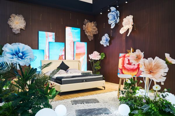 最后,通过艺术共创让展厅“动”起来。为了更好地与观众产生互动,本次展会,Simmons®席梦思在展厅设置了生动有趣的艺术互动环节,也通过春、夏充满生机活力的主题布景,让观众有更多的参与感,让整个展示空间能够流“动”起来。同时,Simmons®席梦思打造极具参与感的艺术共创墙,将设计美学延伸至“体验感”展览空间,由此开启沉浸式睡眠家居探索之旅。