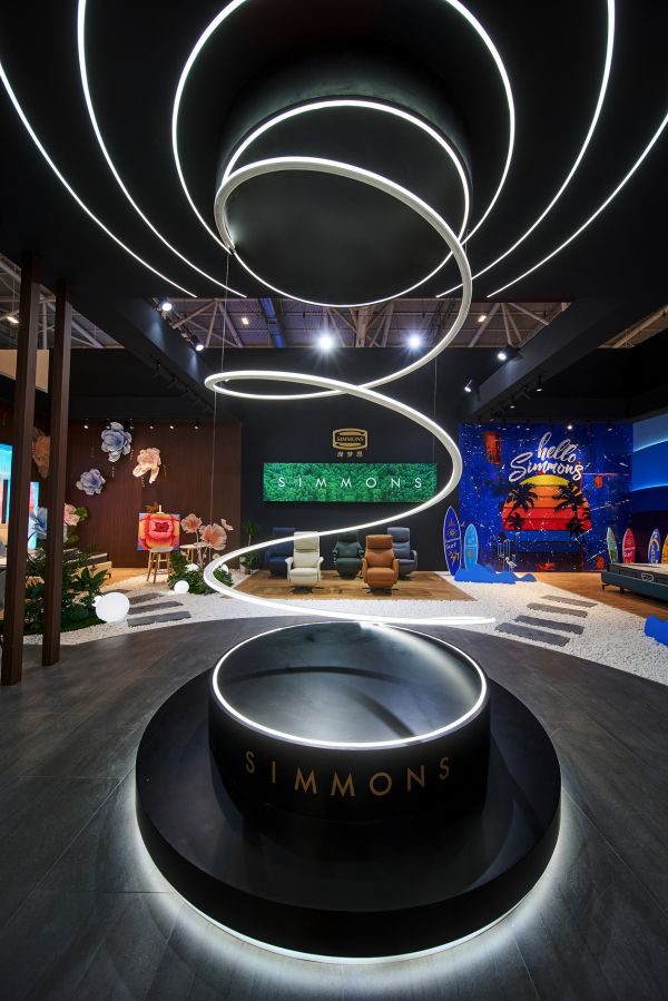 首先,凸显品牌核心科技内核。作为有着153年匠心传承的品牌,Simmons®席梦思能够历经时间洗礼始终占据行业领导者位置,其优势之一就是拥有核心产品科技。本次展会,Simmons®席梦思在整体设计上,运用了大量的弹簧元素来凸显品牌的科技内核,无论是展位的外墙、前台接待处的弹簧形状灯饰,还是展厅设置的大型弹簧装置、主题展区融入的细节弹簧元素,以及现场的软装灯饰等,都能让观众直观地了解到品牌与弹簧之前的强链接。