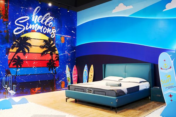 其次,于主题展区打造沉浸式家居美学空间。本次展会Simmons®席梦思更侧重于提升产品的体验,通过场景化的设置,赋予整个展示空间更多的体验感。在精心打造的“梦唤新生”春日主题区,品牌联手当代艺术家杨婉,明亮的色块与流畅的线条交错碰撞,热烈的春日色彩交叠似幻想梦境,为睡眠美学注入艺术解读。而夏日主题展区则以海的深蓝,棕榈树,冲浪板,奔涌的海浪,展现年轻时尚人群的热情蓬勃。 Simmons®席梦思将自然引入睡眠空间,重塑身体、空间与自然的联结。