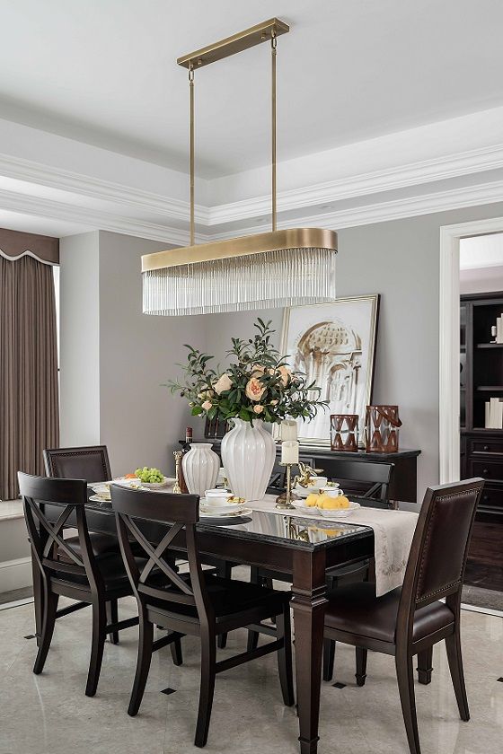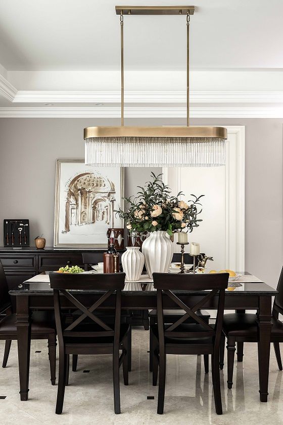 餐桌与餐边柜,搭配丰富的装饰小物,形成多功能休闲区,营造优雅居家的气息,摆上绿植,光线通过落地窗进入,宛如电影画面般光影摇曳,为视觉和嗅觉增添一抹曼妙,同时发酵着空间独有的气质。