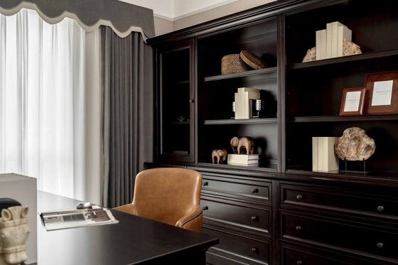 搭配深色系的家具系列,绅雅硬朗的线条流露出层次丰富的秩序美,形成空间的视觉平衡。
