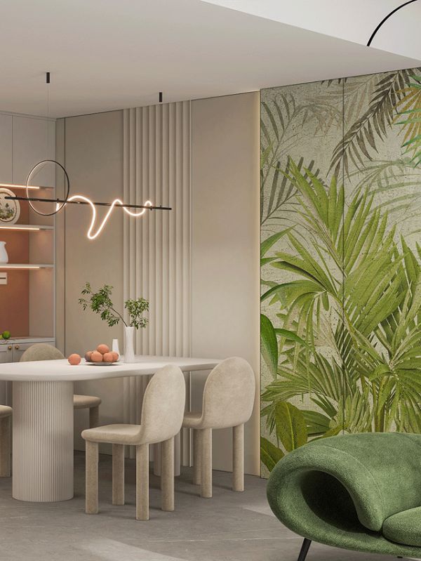 通过融合自然休闲的热带植物元素,雅琪诺打造《葱葱 Luxuriant》这款软装产品。雅琪诺选取标志性的热带植物如散尾竹、蒲葵、天堂鸟等,经过放大、切割、模糊化与流行色的滤镜效果处理,使热带植物的独特形状和线条以更具艺术感的方式呈现与墙面之上。具有层次感的画面处理让家中一角犹如树林掩映,伸手去拨就能触碰栩栩如生的热带植物,走入神秘幽静、趣味十足的热带雨林。充满绿意与生机的墙面,构建了清凉、休闲、自然的整体氛围,令人心旷神怡。