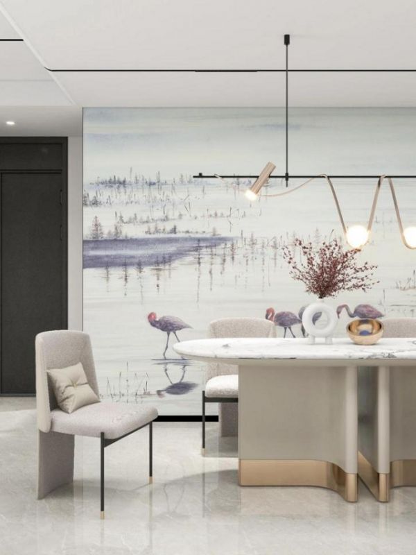 雅琪诺《生趣 Vitality》便是以火烈鸟为灵感,通过细致的笔触将旭日初升之时红鹳涉行浅滩的画面定格下来。画面中的大片浅滩清旷悠远,渐亮的晨光刺破飘渺的晨雾,穿过红鹳泛红的羽毛落在水面上,水面变得波光粼粼。整体画面色彩和谐,各部分之间交相辉映,带来愉悦放松的视觉感受。同时借助水鸟御鱼的形象,寄托生活里“渔利”“生机”的美好意愿,赋予了家居空间更多的意义内涵,打造了宁静致远、隐逸淡泊的整体氛围。