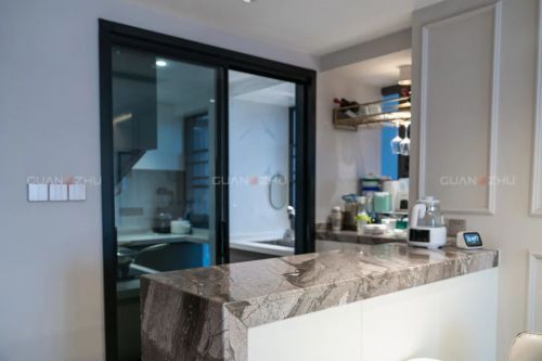 屋主想在餐厅做个吧台,冠珠设计师用1㎡打造一个L型吧台,点一支蜡烛倒一杯红酒,吧台可以是夫妻俩享受浪漫二人世界的小空间;吧台下方配上可移动的餐桌椅,增加空间的自由度。厨房瓷砖通铺耐磨防滑的意大利银莎瓷砖,家里的老人小孩都可以放心走动,不怕滑到,给予家人满满的安全感。
