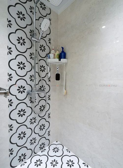 对于卫生间的设计,屋主想要温馨舒适的风格,冠珠设计师选择在卫生间墙面采用布朗灰与盛世华彩两款灰色系瓷砖搭配,用小花砖点缀出空间的层次趣味感;营造复古温馨的感觉。