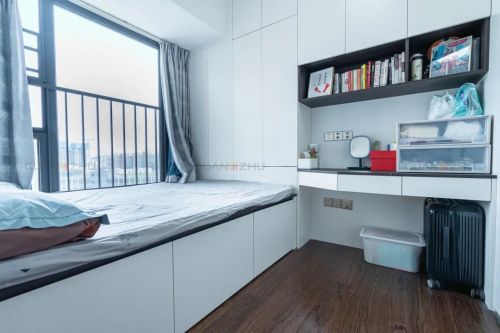 把原本的阳台改为卧室,打造一个榻榻米床,方便父母照看孩子,同时也能但储物柜使用,冬天的被褥等可以统统收纳起来,卧室地板采用是深木+奶白双色拼接,让整个空间错落有致。