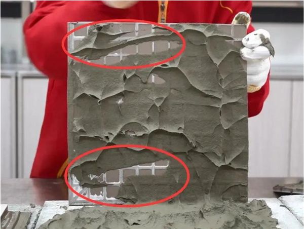 如只在基面上浆,尽管瓷砖胶与基面接触良好,但与砖背的接触往往较差,从下图可看到,砖背是不满浆。