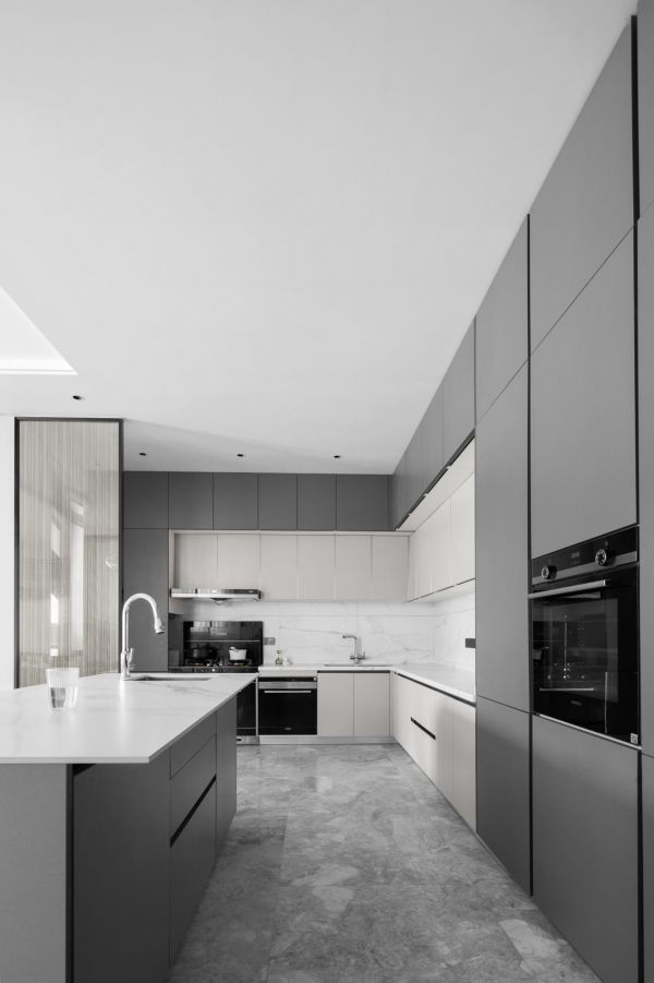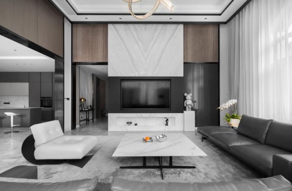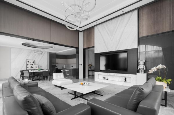高级灰风格以色彩冷静、线条简洁而不失时尚为特色,强调室内空间宽敞、内外通透,追求不受空间所限制的自由。墙面、地面、顶面及家具陈设乃至灯具器皿等均以简洁的造型、纯洁的质地、精细的工艺为特征。