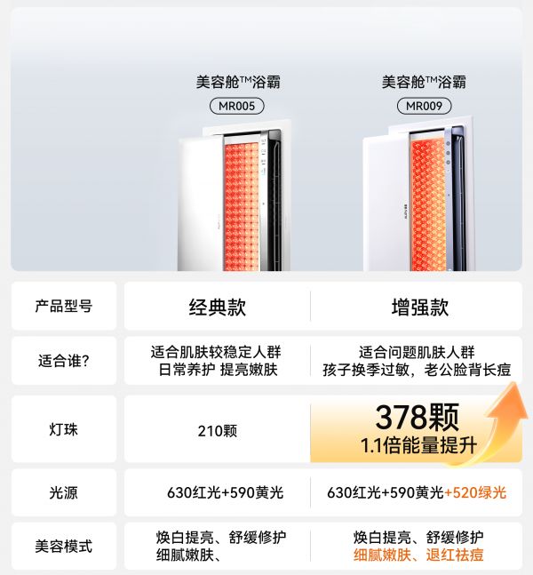 而对于痘痘肌与敏感肌用户,增强款则展现出更全面的设计考量。灯珠数量提升至378颗,光能输出增强110%,新增的绿光模式可有效舒缓炎症,适用于改善背部痘痘、换季敏感等多种皮肤护理需求。于细微处体现对家庭场景中不同年龄段用户的人性化关怀。