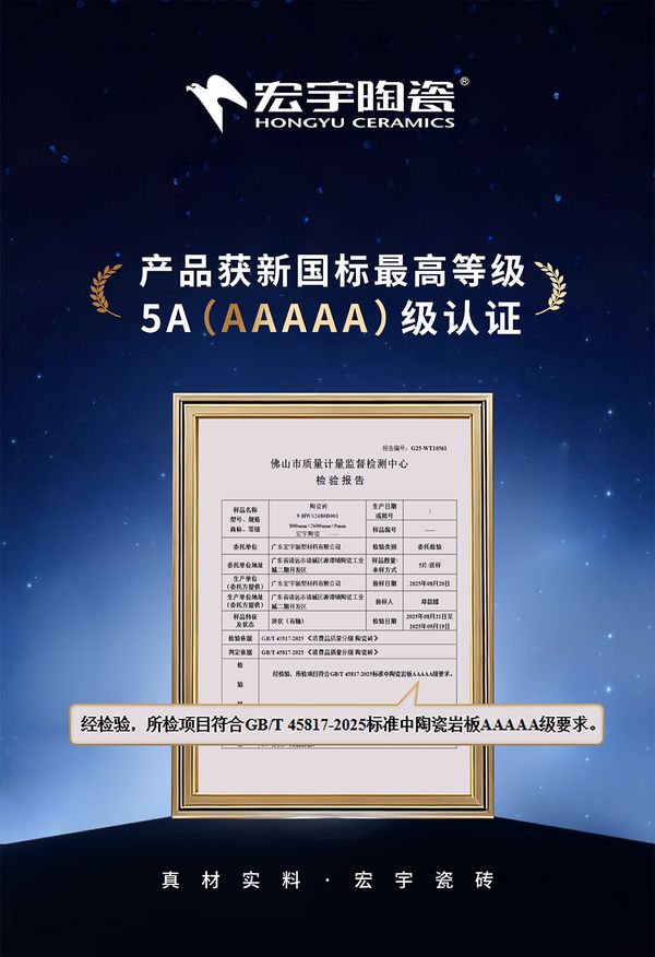 在消费和产业双升级变革的时代中,陶瓷行业正迈向高质量发展的新阶段。宏宇陶瓷作为GB/T 45817-2025《消费品质量分级 陶瓷砖》国家标准的核心制定起草单位之一,宏宇产品率先通过国家最严苛的5A级标准检测,成为行业首批通过新国标5A级认证企业,以行业标杆之力,向祖国高质量发展献礼。
