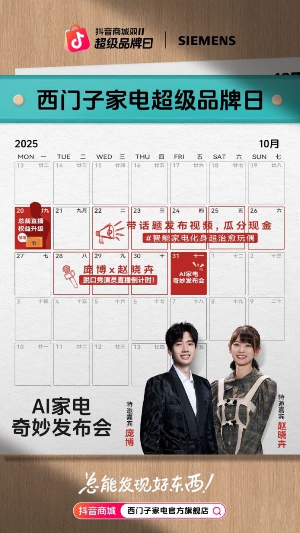 双11购物季已至,西门子家电携手抖音在2025年10月20日-11月5日期间重磅开启超级品牌日活动,以“相嵌相AI才是家”为主题,通过科技创新、美学设计与趣味互动的多维融合,打造兼具理性科技与情感温度的品牌盛宴。本次活动以AI智能与嵌入美学为双核心,通过四大亮点矩阵——IP玩偶超品首发、脱口秀微综艺直播、达人总部直击以及特色店播专栏——全面激发消费者的参与热情与品牌共鸣。
