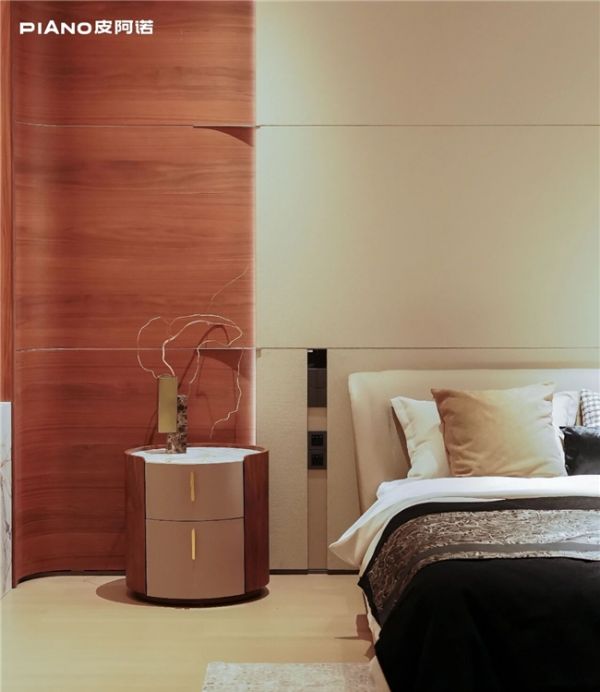 在卧室这一 “休憩核心区”,皮阿诺「峪」系列采用墙柜一体设计,圆弧墙板取意山川的自然弧度,打破传统方正空间的生硬感,搭配铝合金饰条的轻奢点缀,营造出柔和静谧的安眠氛围。特色内嵌式拉手融入门板,线条简洁流畅,睡前整理衣物时无需担心磕碰,指尖触碰的顺滑感进一步舒缓身心。