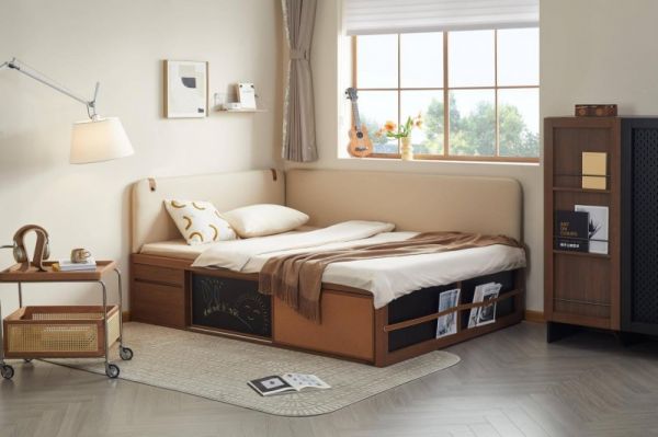 双边护栏床,圆润围边与舒适造型,安全感十足。双面加高护栏,采用生态科技皮包裹,内部海绵填充,倚靠舒适。护栏方向可自由调换,不受位置限制,解锁多种舒睡方式。米白色软包搭配胡桃木纹,配色温暖治愈,营造轻松氛围。底部集合收纳区、抽屉与黑板互动区,既能储物又能涂鸦,功能丰富实用。