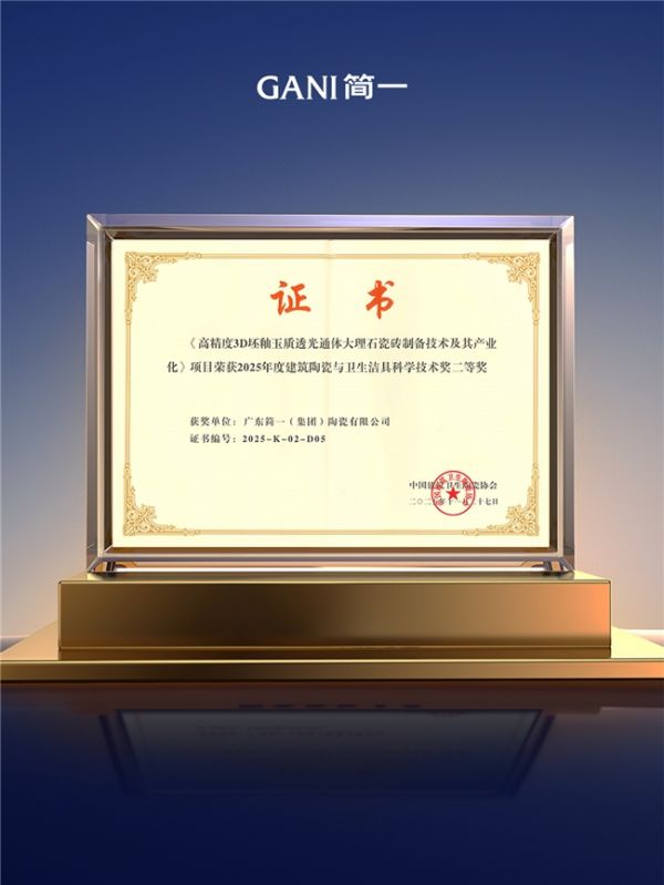 近日,中国建筑卫生陶瓷协会组织召开2025年度科技标准质量工作会,并在会上颁发了多项行业重要奖项。清远市简一陶瓷有限公司与广东简一(集团)陶瓷有限公司凭借“高精度3D坯釉玉质透光通体大理石瓷砖制备技术及其产业化”项目,荣获“建筑陶瓷与卫生洁具科学技术奖-二等奖”。同时,广东简一(集团)陶瓷有限公司还被评为“2025年中国建筑卫生陶瓷协会标准化工作先进单位”。