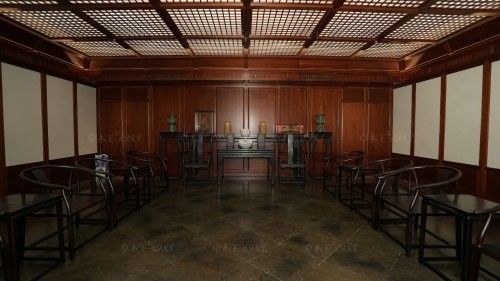 接待厅以红木色为主调,局部留白注入文雅温润气息。主背景墙满铺非柚护墙板,两侧留白区域预留艺术作品悬挂位,平衡质感与审美层次。空间中央坐北朝南对称排布八仙桌、供案、花架及成套椅具,规整的布局里藏着中式的端庄。抬头可见镂空方格透光吊顶,光影洒落间让空间兼具通透感与呼吸感。
