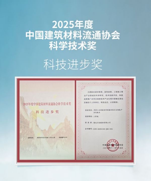 2025年11月25日,惠达凭借深度融合ESG理念的绿色科技,一举斩获2025年度中国建筑材料流通协会科学技术奖中的科技进步类大奖。