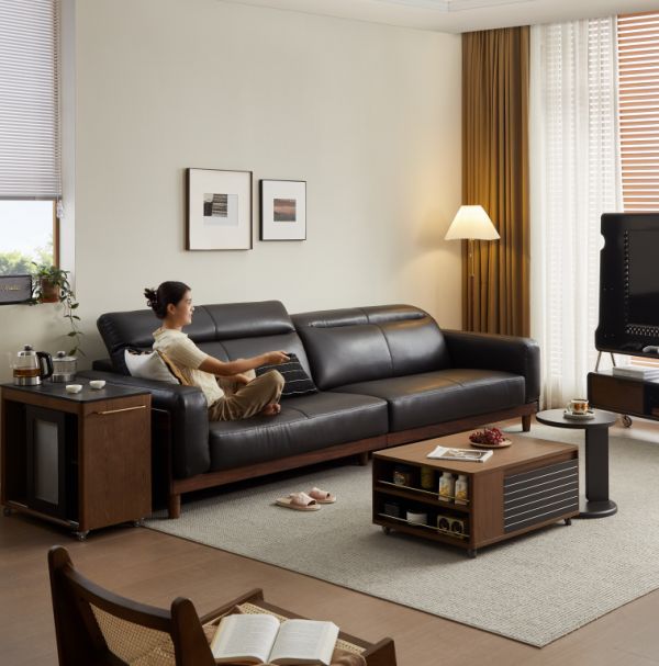 黑色软包与南美胡桃木搭配,材质碰撞出丰富质感,视觉高级且耐看。分段式靠包贴合腰背,宽大座包随意坐卧。头枕可自由调节,后仰时肩颈舒展,包容不同身型,舒适角度由你定义。实木底脚稳固体支撑,坚固耐用,休息时更感踏实。