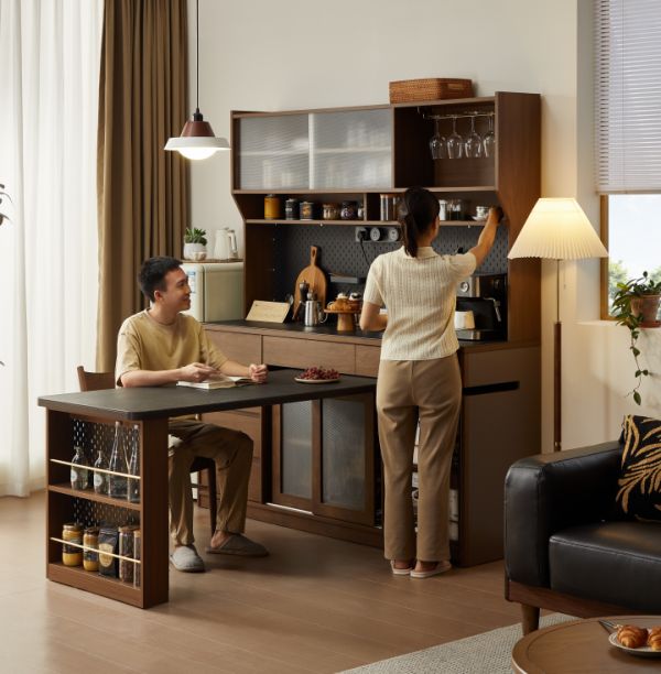 集餐桌、餐边柜与吧台功能于一身,可用于临时办公或休闲娱乐。胡桃木色与黑色相呼应,延续了原木的温润感,又点缀复古气息。L型搭台与柜体自然衔接,可伸缩可旋转,日常收拢节省空间,聚会时展开成为互动中心,大小户型都适配。