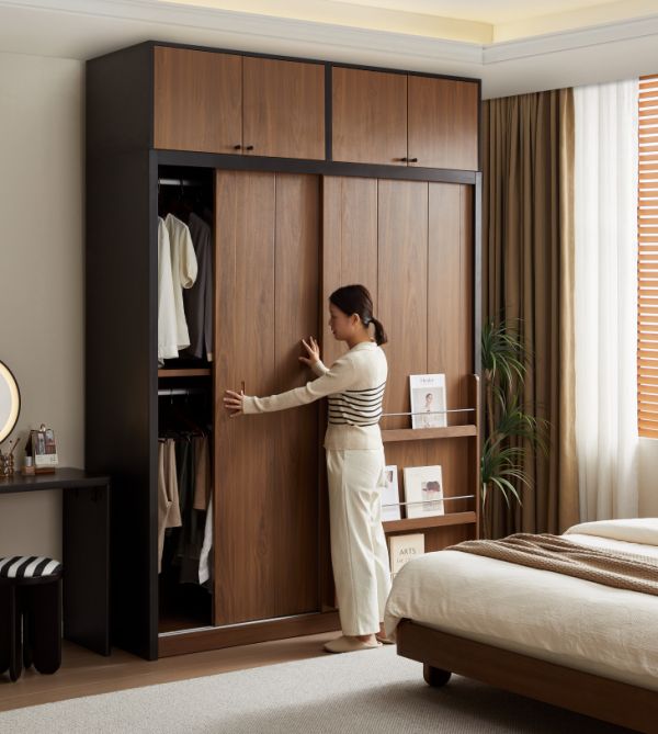 方正移门衣柜,节省过道空间,提供多规格选择,可自由组合边柜、顶柜,大幅提升收纳容量。内部配备皮质衣通与收纳篮,明确划分悬挂区与折叠区,衣物取放一目了然。外侧金属挡条设计成杂志架,实用美观。