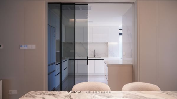 ZMKM芝麻开门家居的3+0隐藏墙内吊轨门,在美学设计上同样令人惊艳。采用黑色竖框搭配8毫米灰玻钢化玻璃,既保持了极简的线条感,又确保了足够的隐私性。玻璃材质的选择充分考虑了厨房环境的特殊性,钢化处理确保安全,灰色调则赋予了一定的遮挡性,同时又不会影响厨房的自然采光。