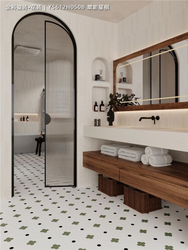 将花砖通铺于湿区地面,搭配原木元素、白色洁具和绿植