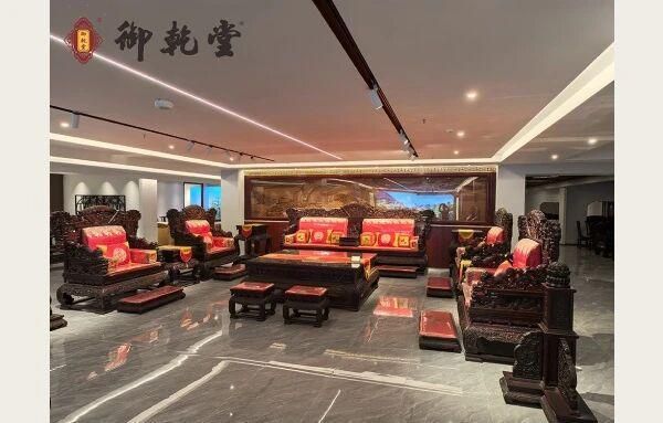 御乾堂红木深耕交趾黄檀、小叶紫檀领域,秉持“三精”理念——选材精良、做工精细、雕刻精美。业务延伸至全屋整装与园林建筑,形成双轮驱动发展模式。