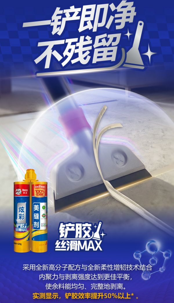 焕新升级的炫彩美缝剂,在铲胶环节做了针对性优化。它采用全新的高分子配方,结合柔性增韧技术,让余料的“内聚力”和“剥离强度”达到了一个更佳的平衡。