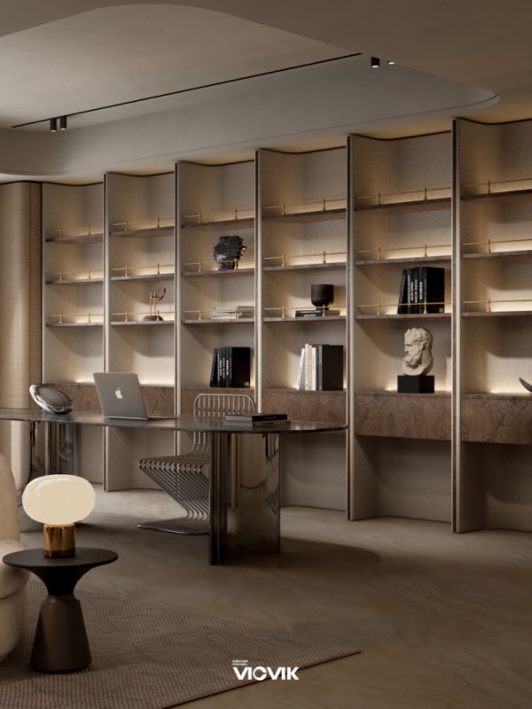 在空间应用上,VICVIK威克美学饰面板实现了不同功能区的自然衔接与美学统一,让静奢质感落地日常。客厅与书房的无界设计中,暖缕·纹叙墙体以温润艺术肌理为基底,如同空间的沉静呼吸自然蔓延;柔织·纹叙饰面板打造的展示柜,以细腻的织物感纹理在灯光下泛起朦胧光晕,与暖缕系列相融相生;弧形家具与浅雅米调书柜的搭配,让线条与肌理碰撞出静谧的阅读角落,墨香与木香在光影中交织,尽显静奢风的精致品味。