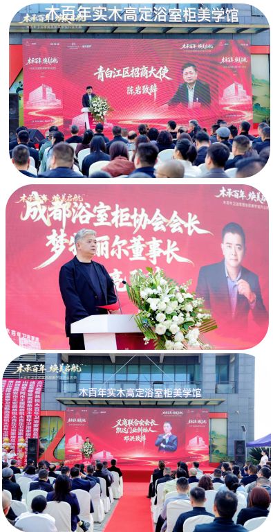 盛典在气势恢宏的开场鼓舞中正式启幕。青白江区招商大使、青白江新联会会长、绣川书院院长陈岩上台致辞,对木百年扎根青白江、赋能区域产业发展给予高度肯定与殷切期望。成都浴室柜协会会长刘开亮、义商联合会会长邓洪先后发表行业寄语,认可木百年在浴室柜领域的匠心坚守与创新引领,勉励品牌与行业共生共荣、协同发展。