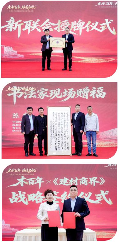 政企领导、行业协会、全国各地经销商、供应链伙伴及主流行业媒体数百人齐聚现场,通过开场鼓舞、嘉宾致辞、授牌赠福、战略签约、剪彩揭幕等完整流程,共同见证木百年品牌里程碑式升级与全新战略启航。